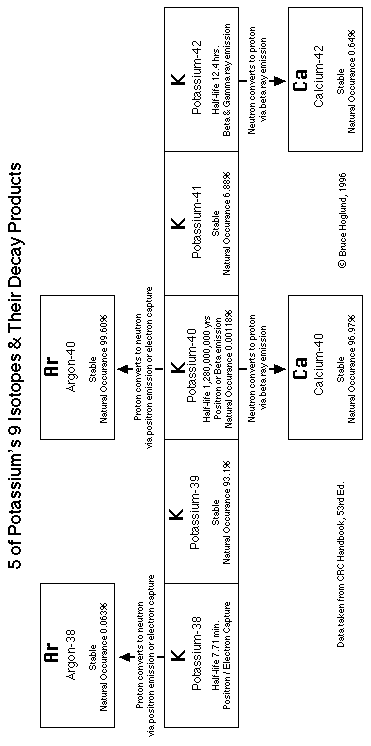 Below is an example diagram of how 5 out of 9 Potassium isotopes radioactively decay (transmute) into other element's isotopes (Argon & Calcium's). Note the unusually long lived Potassium-40 (K-40) with a half-life of 1.28 billion years! It existed before the earth was even born (~4.5 billion years ago), and therefore has been irradiating life since it began! It is responsible for about 14% of your natural radiation dose. Ref. pg. 590